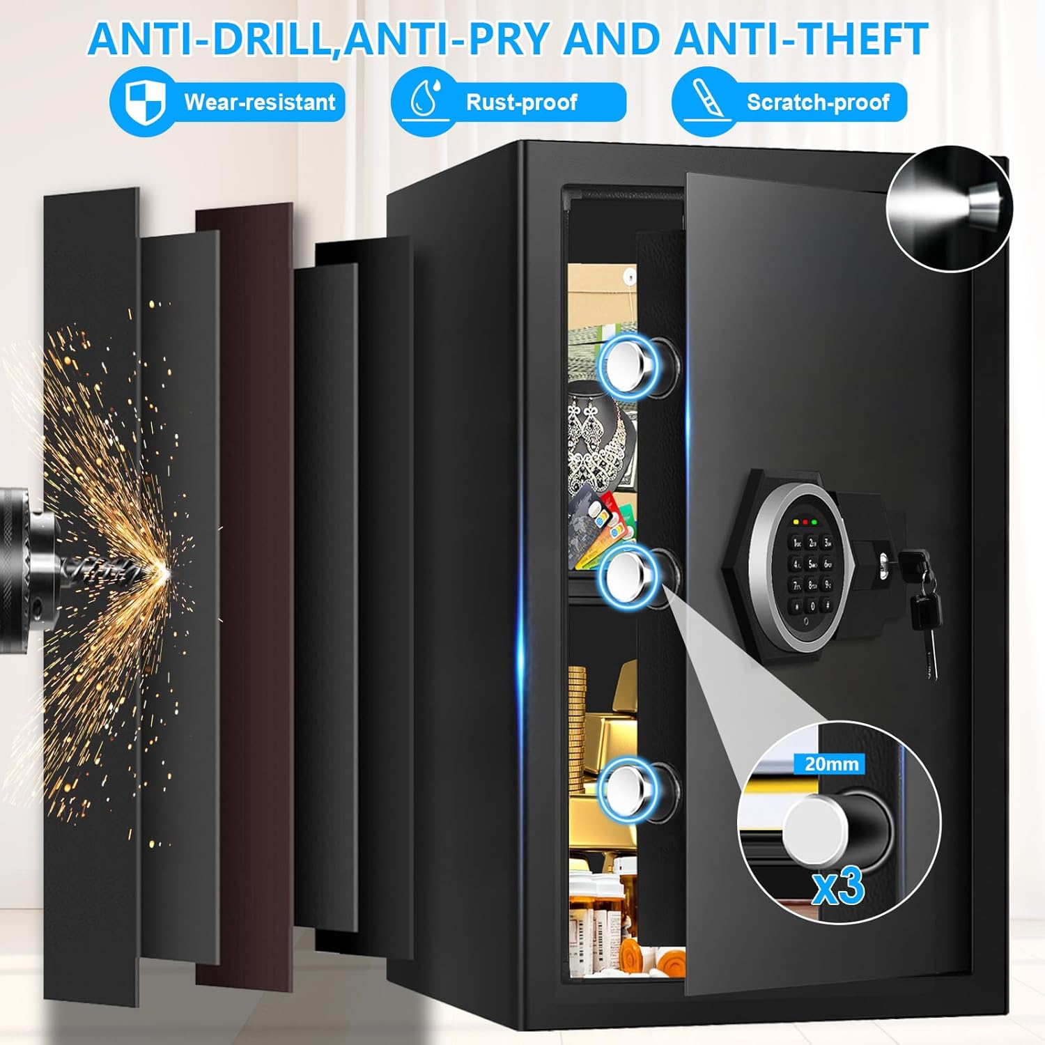 | Additional Features | Anti-Theft, Combination Lock, Fire Resistant, Scratch Resistant, Sensor Light |
