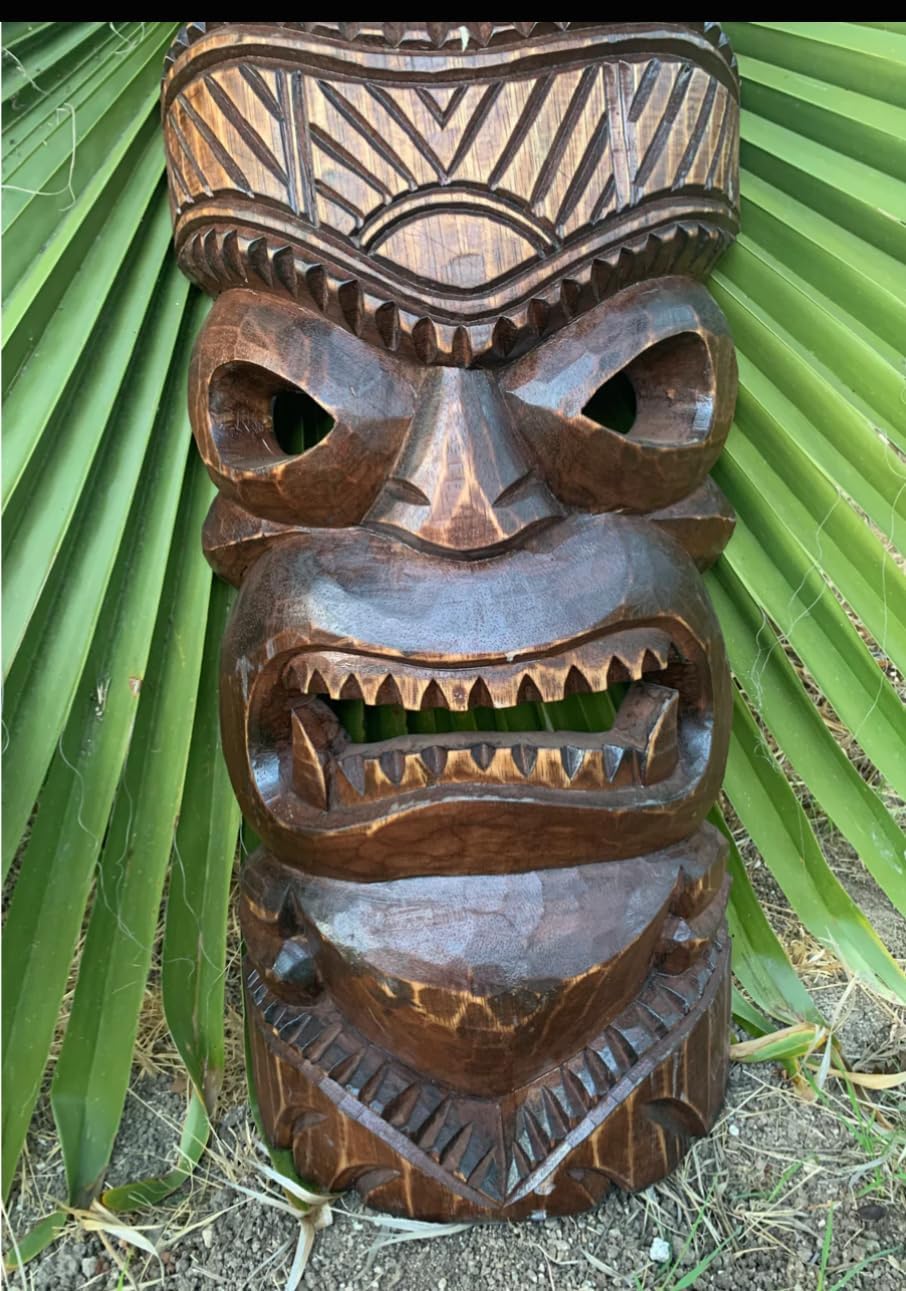 Transform your space with this impressive Polynesian Tiki Totem wooden mask, a stunning piece of decorative art that commands attention with its generous 39-inch height and 11-inch width. Each mask is meticulously hand-carved with intricate geometric patterns and expressive features, showcasing traditional Polynesian artistry. The rich wood staining enhances the dramatic details of the fierce expressions and bold tribal designs. This versatile piece can be mounted either on poles thanks to its hollowed back design or placed flat against walls, making it perfect for indoor spaces or outdoor settings like patios and tiki bars. For outdoor placement, regular maintenance with UV-protective polyurethane gloss spray is recommended to preserve its beauty. The extra-wide design of this particular mask makes it an especially dramatic focal point, ideal for creating an authentic tropical atmosphere in any setting. Whether displayed as a standalone statement piece or paired with other tropical decor, this tiki mask brings a bold splash of Polynesian culture to your space.
