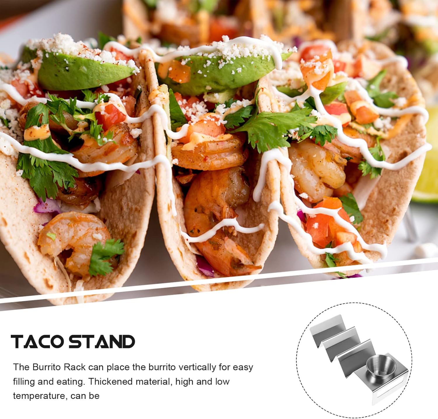 HyKabDescriptionThis Taco Stand is made of stainless steel, , acid and alkali and wear . Designed to keep your food upright and beautifully presented. Whether you're having a party or simply cooking dinner, your delicious Mexican-style food will look perfectly portioned. Welding process, stable and .Features-Color:Silver-Material:Stainless Steel-Size:18.70X10.00X5.00cm; 7.35X3.93X1.97in-Size:6.40X6.40X4.00cm; 2.52X2.52X1.57in-The rack can hold many tacos at the same and them from falling and slipping.-Taco Stand has smooth edges to cutting hands when daily using. A for you.-This Taco Holder is made of premium and good stainless steel, which is highly durable and .-Using this Taco Sand, you can serve buns, sandwiches, burritos, tacos and much more delights.-Suitable for family gatherings, high-end restaurants, outdoor parties or camping barbecues.- Color: Silver.- Size: 18.7X10cm.Package Including1 x Taco Rack1 x Seasoning Cup