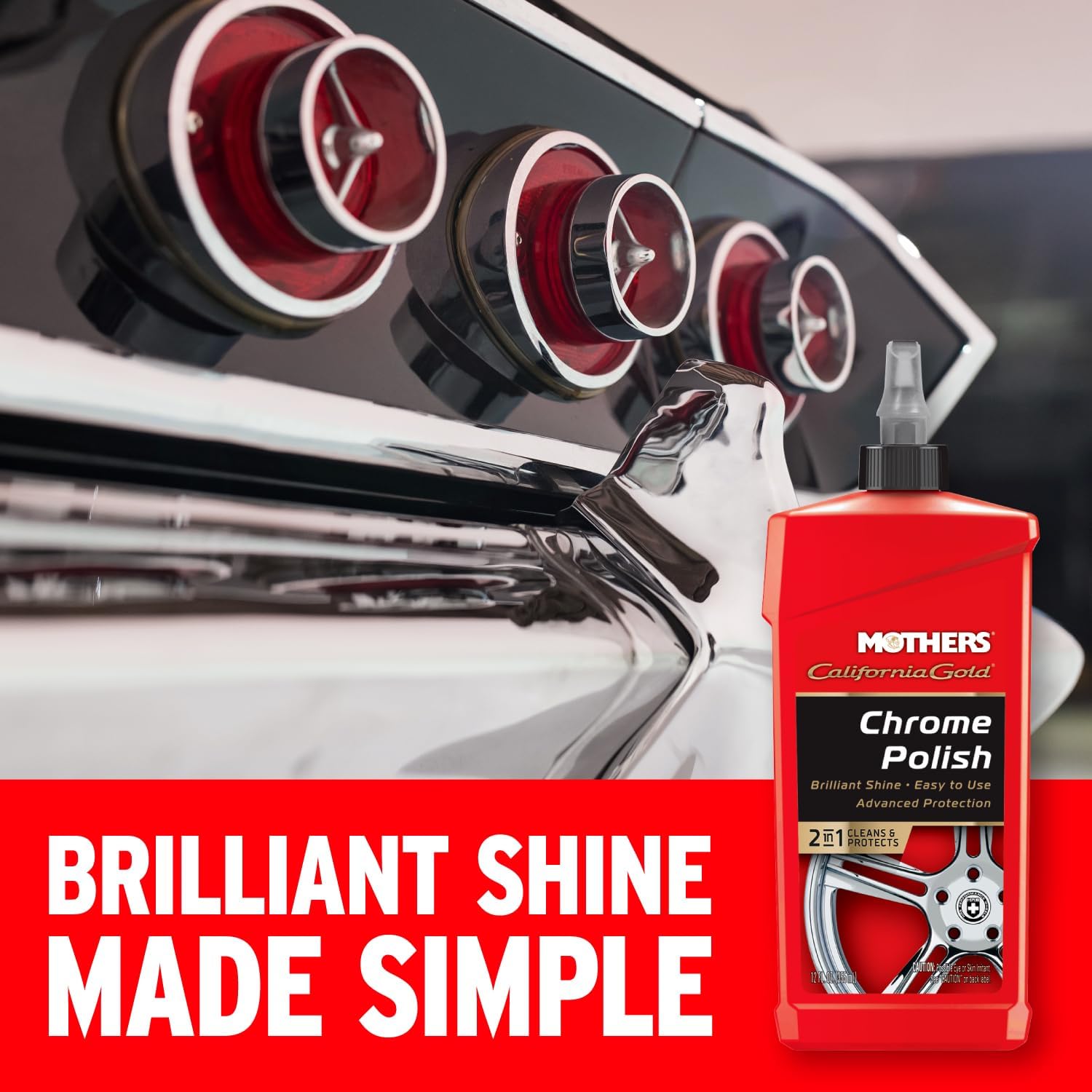 Thick, rich and easy-to-use, Mothers California Gold Chrome Polish gently deep cleans and brightens automotive chrome bumpers, wheels, trim and accessories. Advanced polymers help protect against fingerprints, spotting, rust and corrosion. Chrome Polish also safely cleans and protects exterior glass and mirrors and will not streak, scratch or smear.