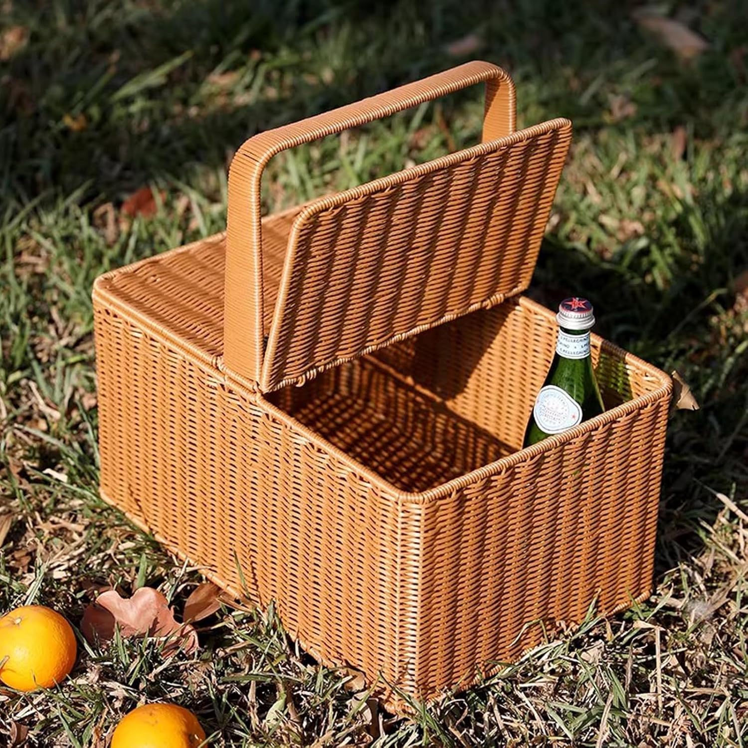 Welcome to my Amazon store!Are you still looking for a multifunctional storage basket? Our storage basket is perfect for you. It complements the country style decoration. This storage basket is well made and has exquisite details, which will definitely give your room a new look.Features:Hand-woven, fine workmanship, beautiful and wear-resistant, long service lifeHandle design to meet your needs, beautiful and layeredBold border, concave and convex design on the side, easy to hold, and carefully woven detailsSmooth and easy to clean, smooth surface, easy to cleanSuitable for various occasions such as home decoration, wedding decoration, outdoor picnics and flower displaysSpecifications:Name: Picnic BasketMaterial: PPSize: 45x30x23 cm/17.7x11.8x9.1 inchesHandle height 20 cm/7.9 inchesWide range of uses: suitable for weddings, proposals, banquets, picnics and other occasions.Package includes: 1 picnic basket