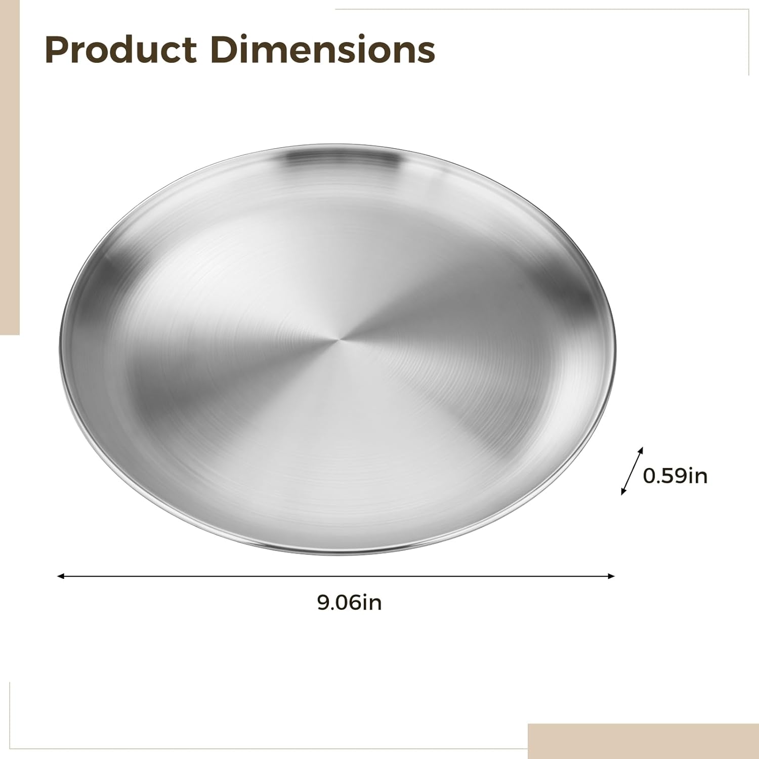 Color:silver Material:stainless steel Product Size: 9.06 in x 7.09 in x 0.59 in Package Includes:large dinner plates x 6 Note: - Please refer to the measurement. Tiny measuring error is allowable in normal range. - There might be a little color difference due to the monitor, camera or other factors, please refer to the physical item.