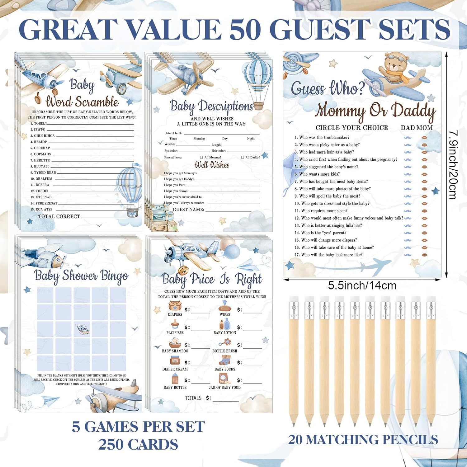 Features: Our airplane baby shower game sets can bring ideal decorative functions and allow you to play games together with your family according to the rules on the wood sign and cards, which is funny and memorable. The airplane baby shower decorations with exquisite prints and vivid colors will bring people visual enjoyment and good moods. The wooden sign can stand firmly on the tables and attract the guests to join the game together. Specifications: Main material: wood and paper Color: main blue Size: Wood sign: approx. 5.12 x 7.87 x 0.2 inches Clothespins: about 1.38 x 0.28 inches Package includes: 250 x Baby shower cards 50 x Clothespins 20 x Pencils 1 x Wooden sign Notes: Manual measurement, please allow slight errors on size. The color may exist a slight difference due to different screen displays. The words on the products are just decorations, not applied as trademarks or brand names