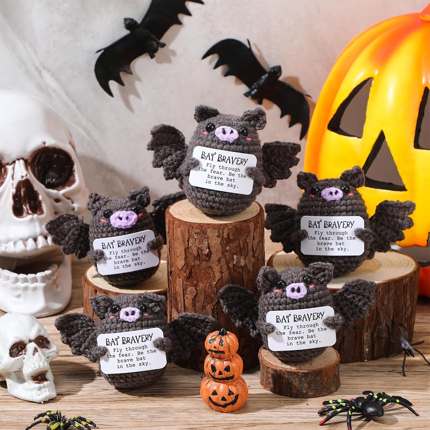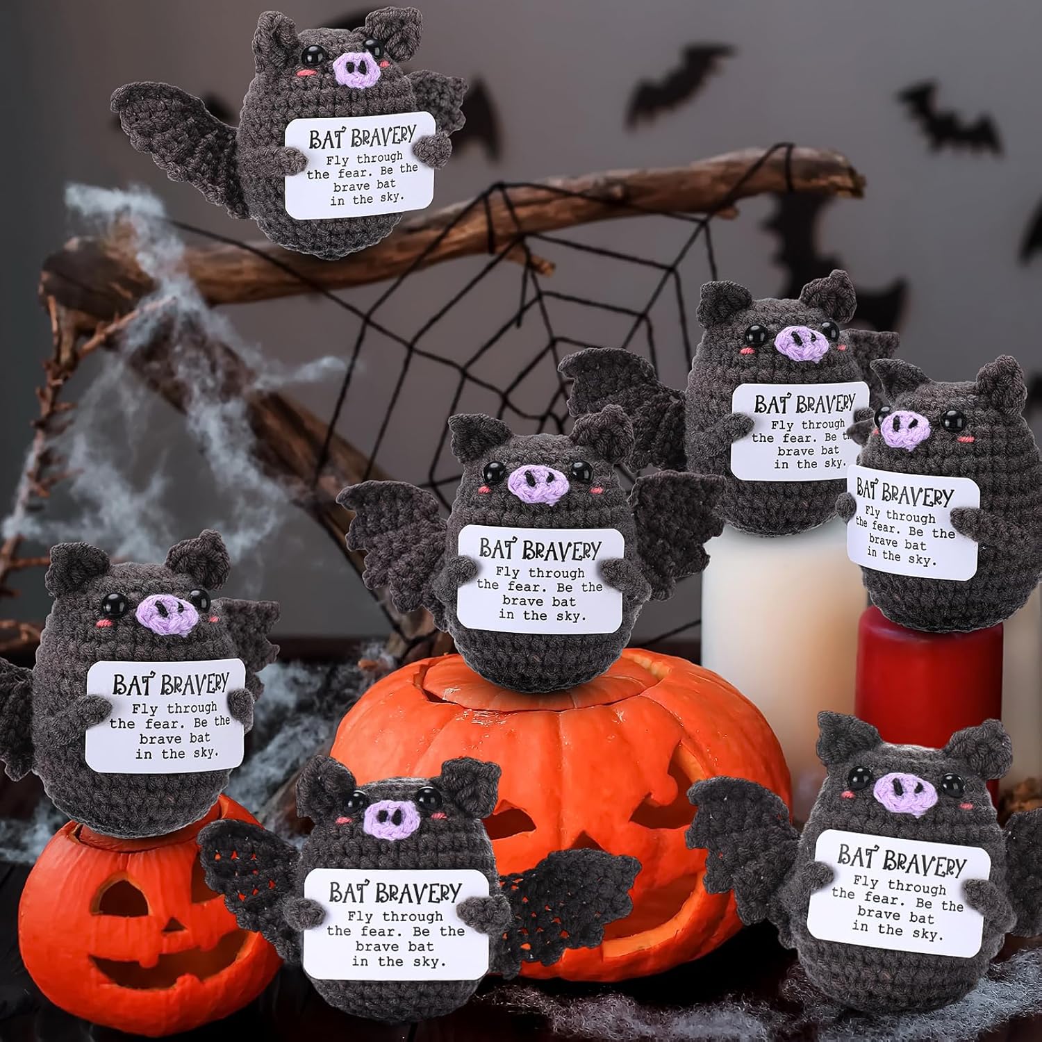 This Halloween crochet bats bulk pack for sharing become daily reminders to stay strong, be patient, and celebrate progress in life. Make them as party favors, holiday party rewards, or trick-or-treat handouts. The included inspirational cards add a thoughtful touch, spreading encouragement alongside festive fun. Specifications: Material: cotton Color: mainly black Size: 3.15 inches / 8 cm Package includes: 12 x Halloween bats crochet animals Notes: Manual measurement, please allow slight errors on size. The color may exist a slight difference due to different screen displays