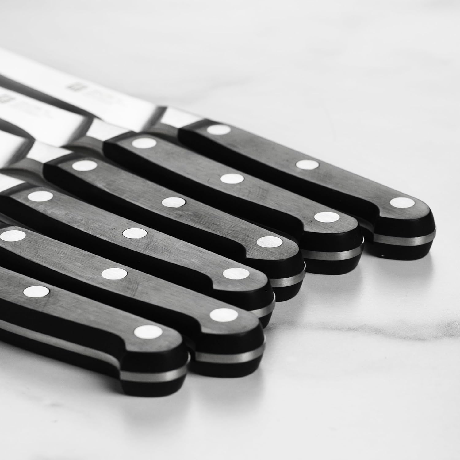 Zwilling Pro Steak Knives simplify slicing through hot baked pork chops or fresh-off-the-grill steaks. Designed by Matteo Thun, they blend aesthetics and functionality in a timeless design. The wedge-shaped blade and half bolster enable cutting along the entire blade length, while the unique curved bolster ensures a secure grip. Crafted from a single piece of Zwilling's exclusive high carbon stainless steel, these knives offer consistent quality, long-lasting sharpness, and precise geometry. The Friodur ice-hardening process enhances cutting performance and corrosion resistance. Each knife is meticulously hand-sharpened, polished, and laser-controlled for a perfect edge. The blade is complemented by a traditional 3-riveted resin handle. Made in Germany with a lifetime warranty.